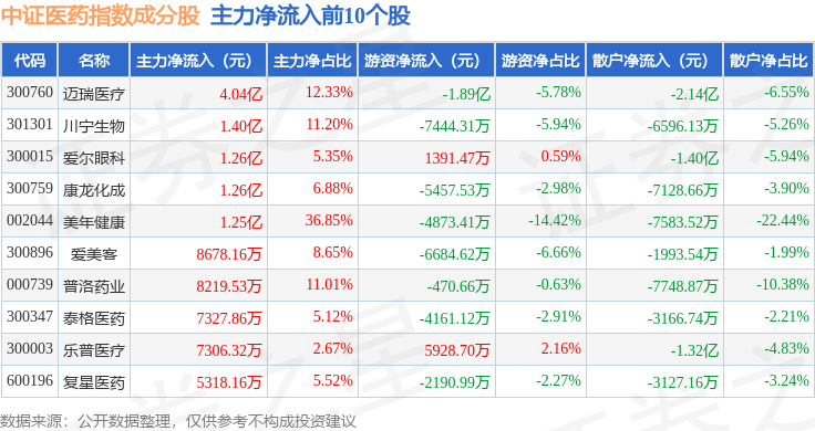 资金流向方面,中证医药(399933)指数成份股当日主力资金净流入合计6.99亿元,游资资金净流出合计3.82亿元,散户资金净流出合计3.17亿元。成份股资金流向详情见下表: