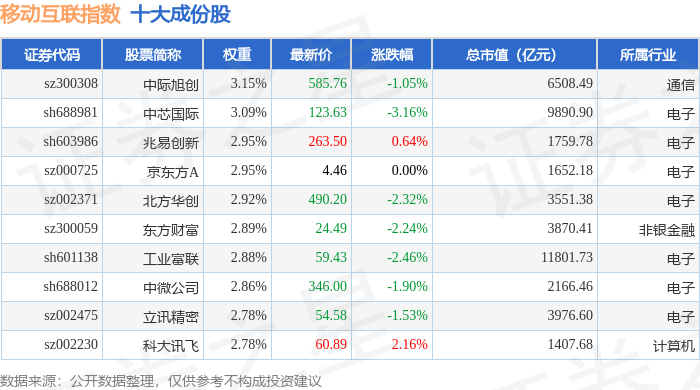 移动互联(399970)指数十大成份股详情如下: