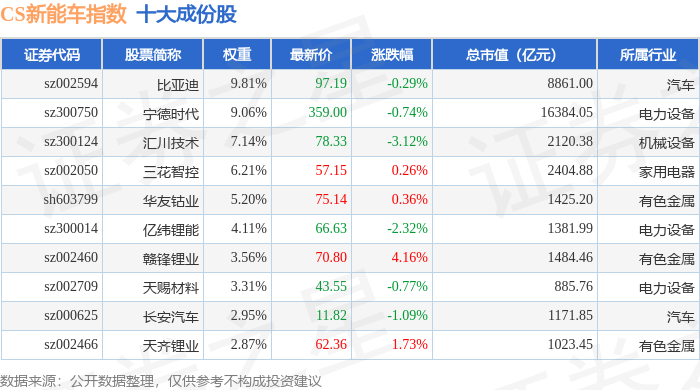 CS新能车(399976)指数十大成份股详情如下: