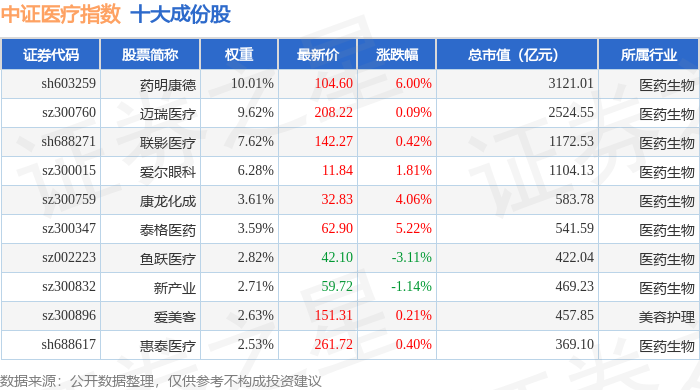 证券之星消息,1月13日,中证医疗(399989)指数报收于7712.92点,涨1.66%,成交593.79亿元,换手率4.53%。当日该指数成份股中,上涨的有34家,美年健康以9.94%的涨幅领涨,下跌的有16家,美好医疗以6.93%的跌幅领跌。