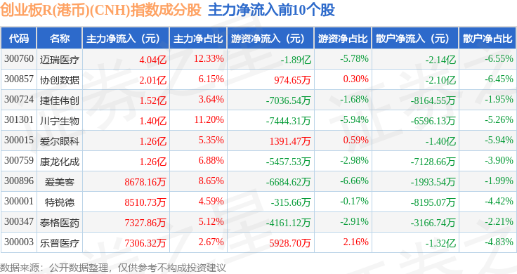资金流向方面,创业板R(港币)(CNH)(470006)指数成份股当日主力资金净流出合计247.03亿元,游资资金净流入合计83.6亿元,散户资金净流入合计163.43亿元。成份股资金流向详情见下表: