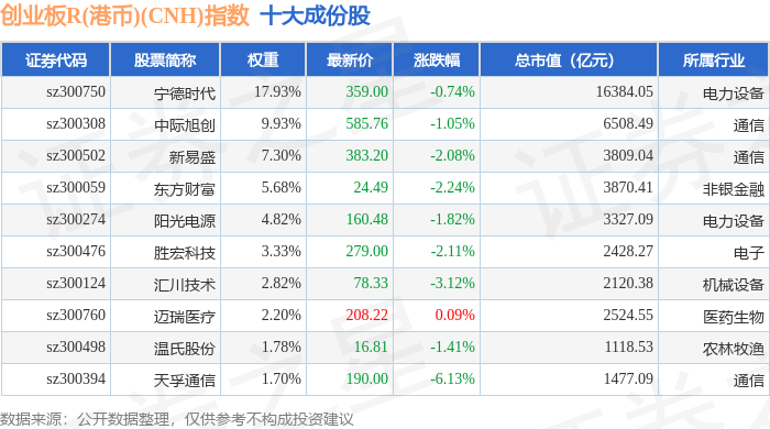 创业板R(港币)(CNH)(470006)指数十大成份股详情如下: