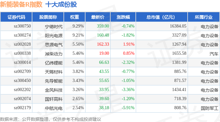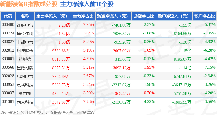 资金流向方面,新能装备R(470043)指数成份股当日主力资金净流出合计104.72亿元,游资资金净流入合计23.59亿元,散户资金净流入合计81.13亿元。成份股资金流向详情见下表: