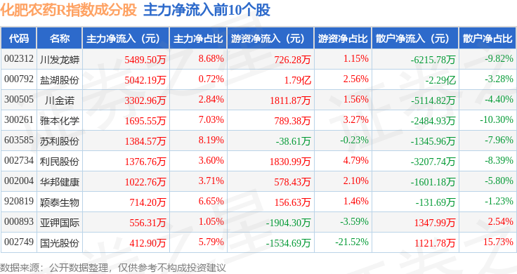 资金流向方面,化肥农药R(480035)指数成份股当日主力资金净流出合计8.02亿元,游资资金净流入合计4.98亿元,散户资金净流入合计3.11亿元。成份股资金流向详情见下表: