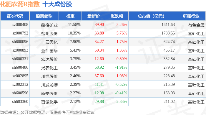 证券之星消息,1月13日,化肥农药R(480035)指数报收于2914.42点,涨1.23%,成交274.99亿元,换手率2.63%。当日该指数成份股中,上涨的有23家,盐湖股份以5.76%的涨幅领涨,下跌的有37家,中欣氟材以4.41%的跌幅领跌。
