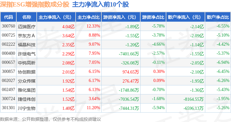 资金流向方面,深指ESG增强(970032)指数成份股当日主力资金净流出合计285.69亿元,游资资金净流入合计78.26亿元,散户资金净流入合计207.43亿元。成份股资金流向详情见下表:
