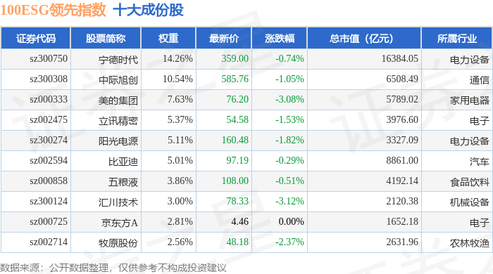 100ESG领先(970030)指数十大成份股详情如下: