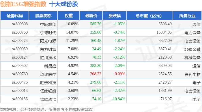 资金流向方面,创指ESG增强(970034)指数成份股当日主力资金净流出合计96.47亿元,游资资金净流入合计29.46亿元,散户资金净流入合计67.01亿元。成份股资金流向详情见下表: