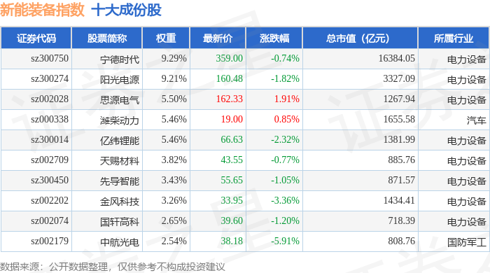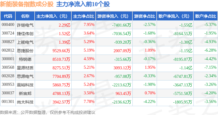 资金流向方面,新能装备(970043)指数成份股当日主力资金净流出合计104.72亿元,游资资金净流入合计23.59亿元,散户资金净流入合计81.13亿元。成份股资金流向详情见下表: