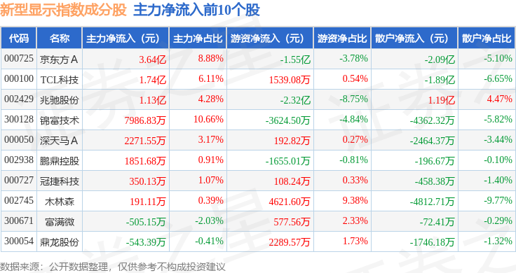资金流向方面,新型显示(970048)指数成份股当日主力资金净流出合计60.01亿元,游资资金净流入合计9.67亿元,散户资金净流入合计50.34亿元。成份股资金流向详情见下表: