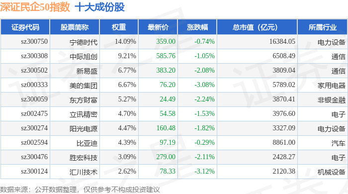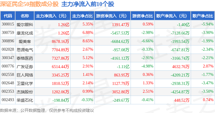 资金流向方面,深证民企50(970057)指数成份股当日主力资金净流出合计162.33亿元,游资资金净流入合计47.48亿元,散户资金净流入合计114.84亿元。成份股资金流向详情见下表: