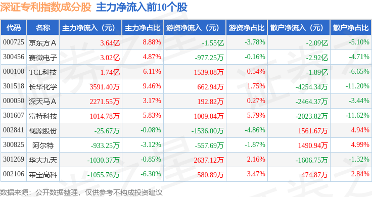 资金流向方面,深证专利(970067)指数成份股当日主力资金净流出合计137.21亿元,游资资金净流入合计37.16亿元,散户资金净流入合计100.05亿元。成份股资金流向详情见下表: