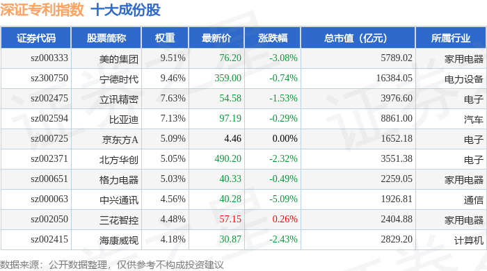 证券之星消息,1月13日,深证专利(970067)指数报收于5104.08点,跌1.72%,成交1729.8亿元,换手率3.1%。当日该指数成份股中,上涨的有6家,迪安诊断以11.9%的涨幅领涨,下跌的有43家,新雷能以8.34%的跌幅领跌。