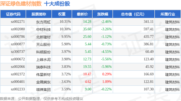 证券之星消息,1月13日,深证绿色建材(970077)指数报收于1398.4点,跌2.25%,成交84.43亿元,换手率2.22%。当日该指数成份股中,上涨的有4家,青龙管业以1.96%的涨幅领涨,下跌的有26家,鲁阳节能以6.57%的跌幅领跌。