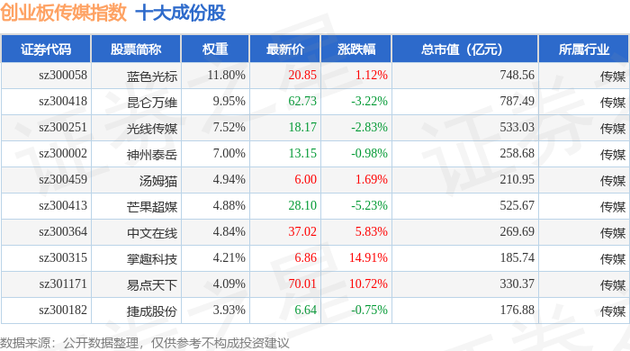 证券之星消息,1月13日,创业板传媒(970084)指数报收于1809.57点,涨0.76%,成交1302.33亿元,换手率21.29%。当日该指数成份股中,上涨的有16家,天龙集团以19.97%的涨幅领涨,下跌的有25家,华策影视以6.95%的跌幅领跌。
