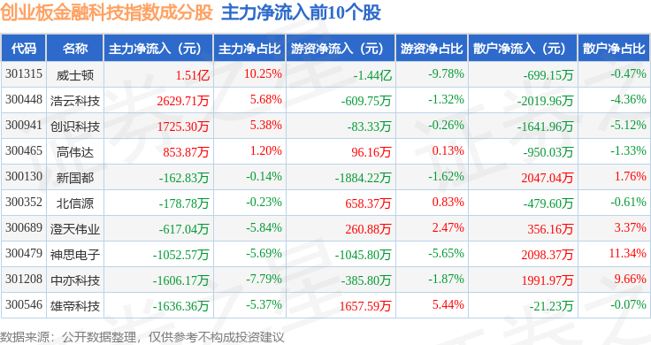 资金流向方面,创业板金融科技(970085)指数成份股当日主力资金净流出合计75.04亿元,游资资金净流入合计13.46亿元,散户资金净流入合计61.59亿元。成份股资金流向详情见下表: