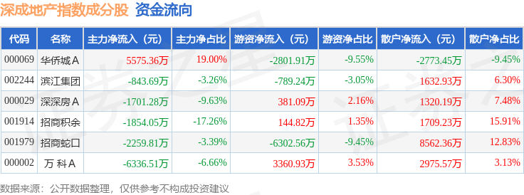 资金流向方面,深成地产(971001)指数成份股当日主力资金净流出合计7419.97万元,游资资金净流出合计6006.87万元,散户资金净流入合计1.34亿元。成份股资金流向详情见下表: