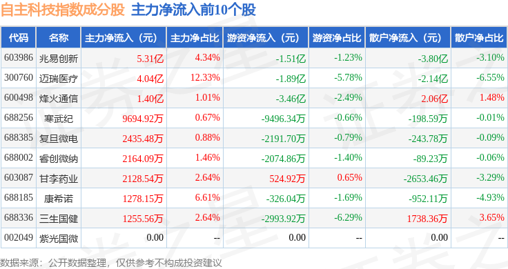 资金流向方面,自主科技(980033)指数成份股当日主力资金净流出合计95.43亿元,游资资金净流入合计46.01亿元,散户资金净流入合计49.43亿元。成份股资金流向详情见下表: