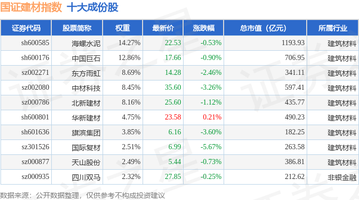 证券之星消息,1月13日,国证建材(980048)指数报收于5026.76点,跌1.65%,成交117.03亿元,换手率2.08%。当日该指数成份股中,上涨的有5家,金隅集团以9.79%的涨幅领涨,下跌的有25家,九鼎新材以6.18%的跌幅领跌。