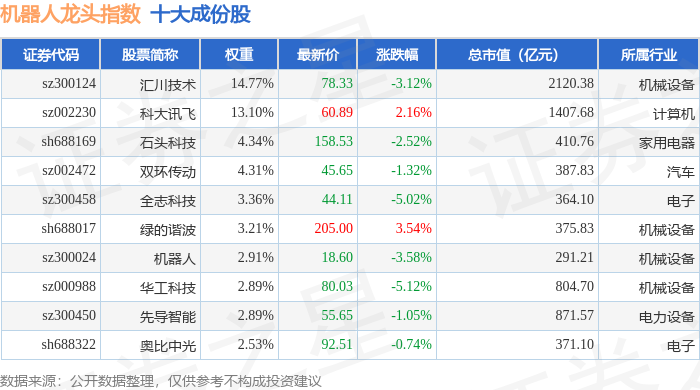 机器人龙头(980071)指数十大成份股详情如下: