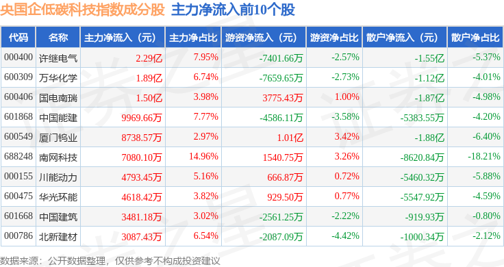 资金流向方面,央国企低碳科技(980082)指数成份股当日主力资金净流出合计68.84亿元,游资资金净流入合计19.3亿元,散户资金净流入合计49.54亿元。成份股资金流向详情见下表: