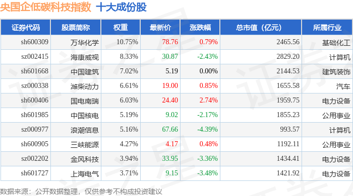 央国企低碳科技(980082)指数十大成份股详情如下: