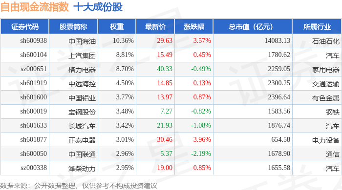 自由现金流(980092)指数十大成份股详情如下: