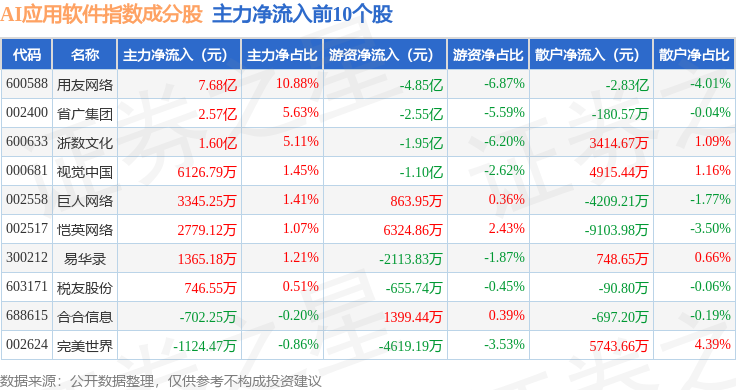 资金流向方面,AI应用软件(980107)指数成份股当日主力资金净流出合计133.23亿元,游资资金净流入合计37.14亿元,散户资金净流入合计96.08亿元。成份股资金流向详情见下表: