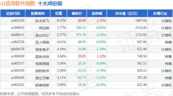 AI应用软件(980107)指数十大成份股详情如下: