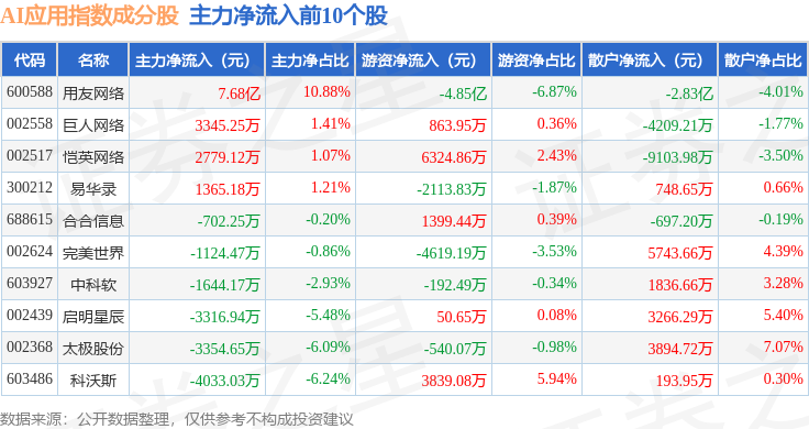 资金流向方面,AI应用(980112)指数成份股当日主力资金净流出合计143.09亿元,游资资金净流入合计46.07亿元,散户资金净流入合计97.02亿元。成份股资金流向详情见下表: