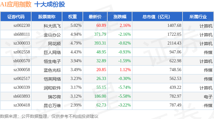 证券之星消息,1月13日,AI应用(980112)指数报收于1993.15点,跌1.65%,成交1963.83亿元,换手率11.03%。当日该指数成份股中,上涨的有8家,用友网络以7.87%的涨幅领涨,下跌的有42家,恒玄科技以9.67%的跌幅领跌。