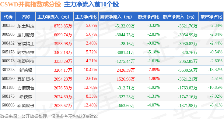 资金流向方面,CSWD并购(399992)指数成份股当日主力资金净流出合计68.03亿元,游资资金净流入合计20.86亿元,散户资金净流入合计46.23亿元。成份股资金流向详情见下表: