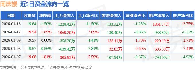 证券之星消息,截至2026年1月13日收盘,同庆楼(605108)报收于19.64元,下跌1.5%,换手率2.07%,成交量5.39万手,成交额1.07亿元。