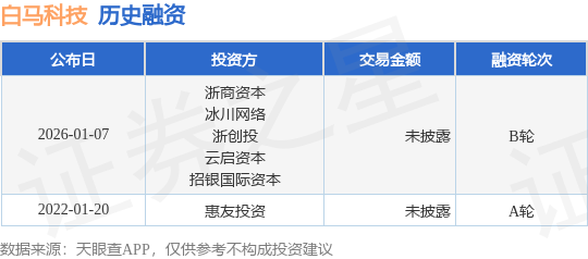 证券之星消息,根据天眼查APP于1月7日公布的信息整理,浙江白马科技有限公司B轮融资,融资额未披露,参与投资的机构包括浙商资本,冰川网络,浙创投,云启资本,招银国际资本。