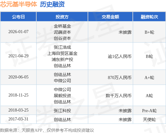 证券之星消息,根据天眼查APP于1月7日公布的信息整理,上海芯元基半导体科技有限公司B+轮融资,融资额未披露,参与投资的机构包括金桥基金,泥藕资本,创谷资本。