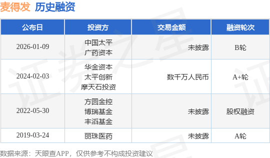 证券之星消息,根据天眼查APP于1月9日公布的信息整理,珠海麦得发生物科技股份有限公司B轮融资,融资额未披露,参与投资的机构包括中国太平,广药资本。