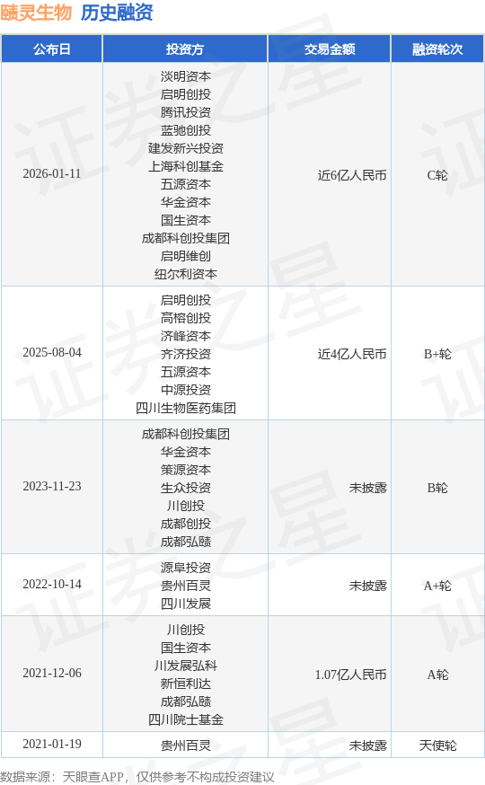 证券之星消息,根据天眼查APP于1月11日公布的信息整理,成都赜灵生物医药科技股份有限公司C轮融资,融资额近6亿人民币,参与投资的机构包括淡明资本,启明创投,腾讯投资,蓝驰创投,建发新兴投资,上海科创基金,五源资本,华金资本,国生资本,成都科创投集团,启明维创,纽尔利资本。