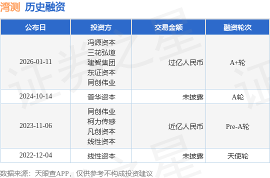 证券之星消息,根据天眼查APP于1月11日公布的信息整理,深圳市湾测技术有限公司A+轮融资,融资额过亿人民币,参与投资的机构包括冯源资本,三花弘道,建智集团,东证资本,同创伟业。