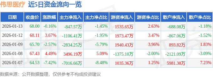 证券之星消息,截至2026年1月13日收盘,伟思医疗(688580)报收于68.0元,下跌0.16%,换手率9.0%,成交量8.62万手,成交额5.83亿元。