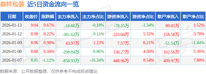 证券之星消息,截至2026年1月13日收盘,森林包装(605500)报收于9.04元,上涨0.67%,换手率1.57%,成交量6.49万手,成交额5842.2万元。