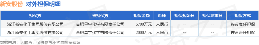 新安股份1月12日披露2笔对外担保,被担保方为合肥星宇化学有限责任公司。对外担保明细如下表:
