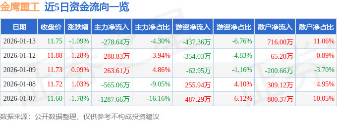 1月13日的资金流向数据方面,主力资金净流出278.64万元,占总成交额4.3%,游资资金净流出437.36万元,占总成交额6.76%,散户资金净流入716.0万元,占总成交额11.06%。