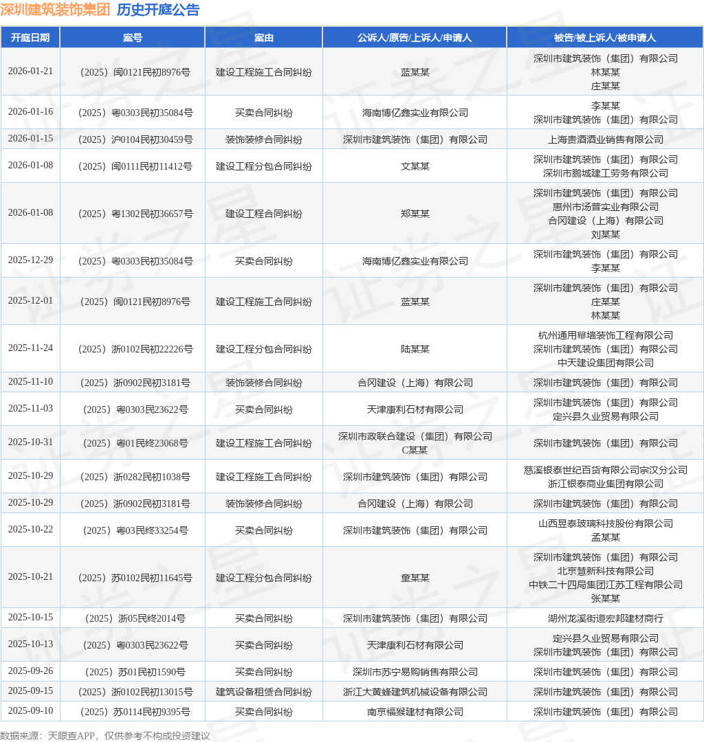 案号:(2025)粤0303民初35084号根据统计,近一年内以深圳市建筑装饰(集团)有限公司为当事人的历史开庭公告有81则,其中案由为“买卖合同纠纷”的公告以17则居首,其次为“装饰装修合同纠纷”有13则,“建设工程施工合同纠纷”有12则。历史开庭公告(前20条)如下: