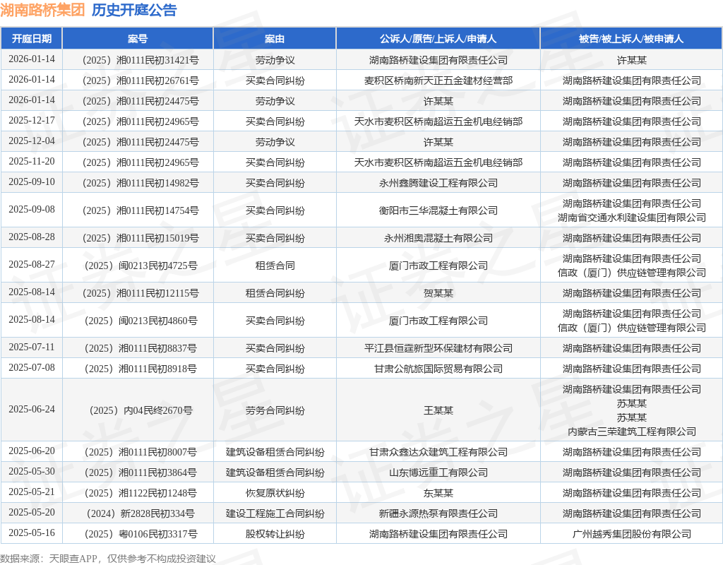 案号:(2025)湘0111民初26761号根据统计,近一年内以湖南路桥建设集团有限责任公司为当事人的历史开庭公告有41则,其中案由为“买卖合同纠纷”的公告以14则居首,其次为“劳务合同纠纷”有5则,“劳动争议”有5则。历史开庭公告(前20条)如下: