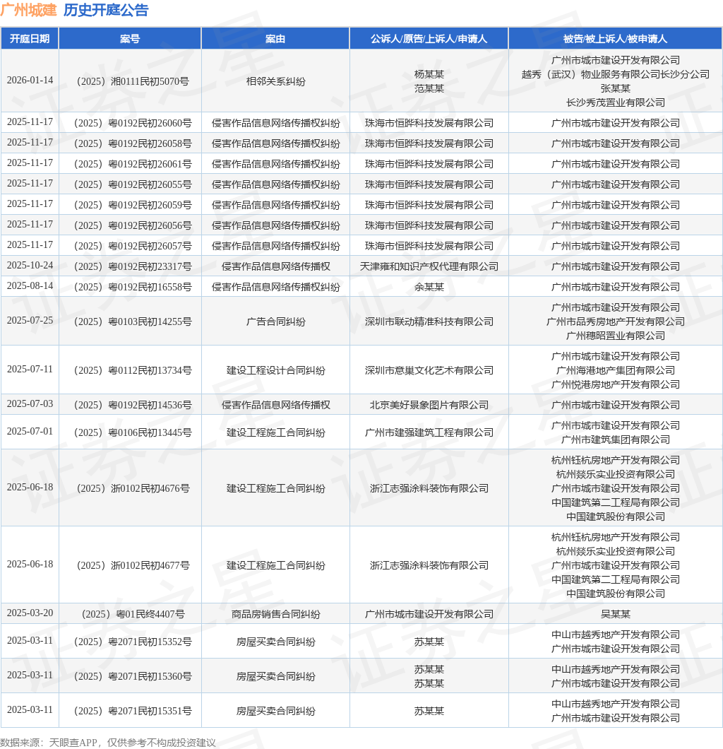 案号:(2025)湘0111民初5070号根据统计,近一年内以广州市城市建设开发有限公司为当事人的历史开庭公告有27则,其中案由为“侵害作品信息网络传播权纠纷”的公告以10则居首,其次为“房屋买卖合同纠纷”有6则,“建设工程施工合同纠纷”有3则。历史开庭公告(前20条)如下: