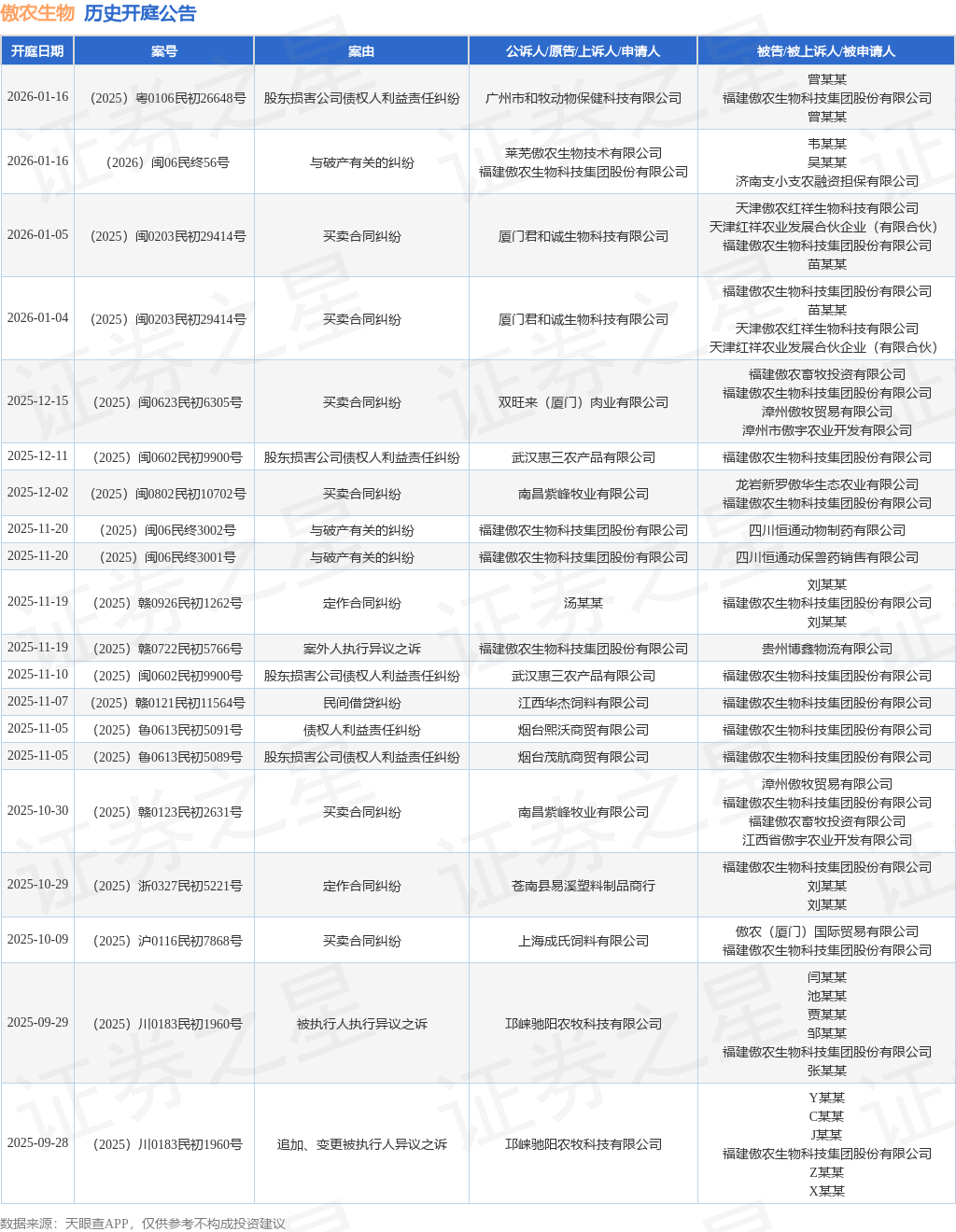 案号:(2026)闽06民终56号根据统计,近一年内以福建傲农生物科技集团股份有限公司为当事人的历史开庭公告有92则,其中案由为“买卖合同纠纷”的公告以37则居首,其次为“与破产有关的纠纷”有17则,“金融借款合同纠纷”有11则。历史开庭公告(前20条)如下: