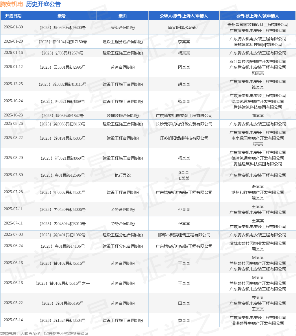 案号:(2025)浙05民终2574号根据统计,近一年内以广东腾安机电安装工程有限公司为当事人的历史开庭公告有57则,其中案由为“劳务合同纠纷”的公告以24则居首,其次为“建设工程施工合同纠纷”有14则,“买卖合同纠纷”有6则。历史开庭公告(前20条)如下: