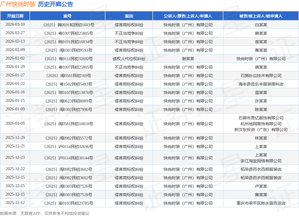 案号:(2025)琼0107民初13876号根据统计,近一年内以快尚时装(广州)有限公司为当事人的历史开庭公告有168则,其中案由为“侵害商标权纠纷”的公告以133则居首,其次为“商标权权属、侵权纠纷”有8则,“侵害商标权”有7则。历史开庭公告(前20条)如下: