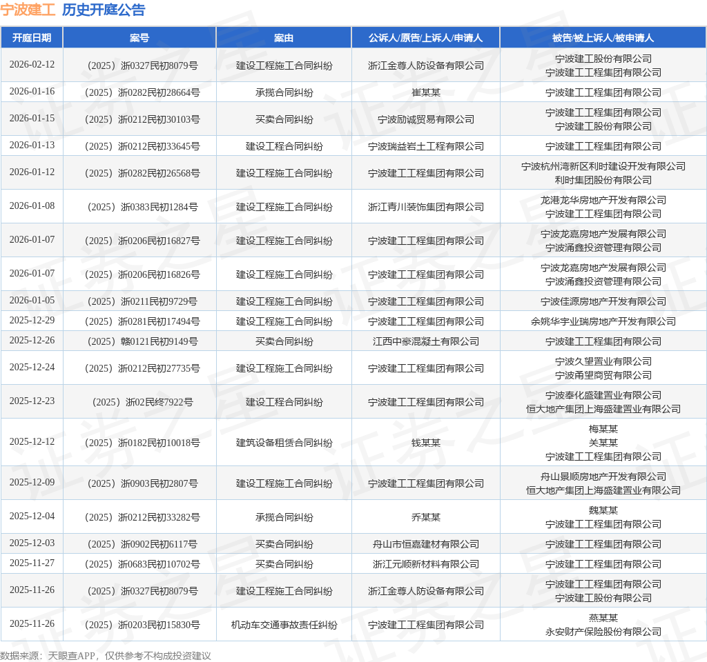案号:(2025)浙0282民初28664号根据统计,近一年内以宁波建工工程集团有限公司为当事人的历史开庭公告有139则,其中案由为“建设工程施工合同纠纷”的公告以41则居首,其次为“买卖合同纠纷”有30则,“建设工程合同纠纷”有20则。历史开庭公告(前20条)如下: