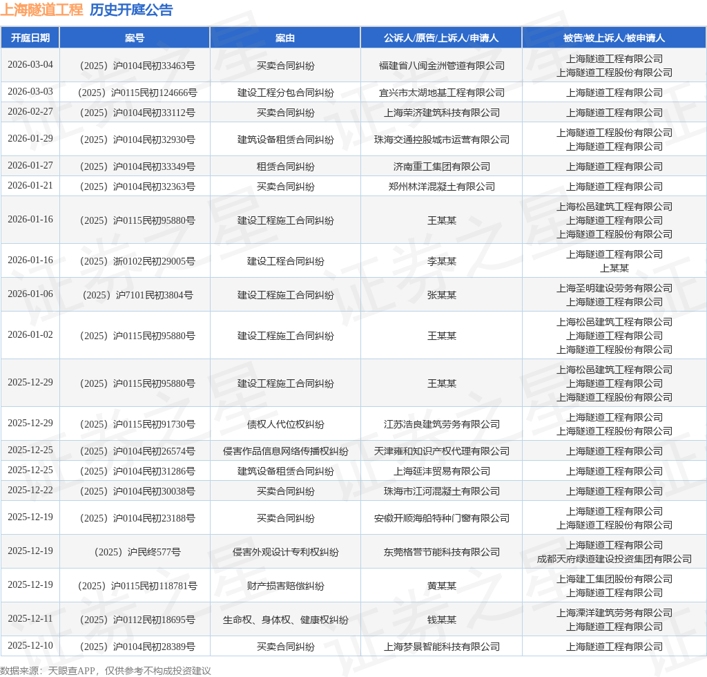 案号:(2025)浙0102民初29005号根据统计,近一年内以上海隧道工程有限公司为当事人的历史开庭公告有124则,其中案由为“买卖合同纠纷”的公告以23则居首,其次为“建设工程分包合同纠纷”有16则,“租赁合同纠纷”有12则。历史开庭公告(前20条)如下:
